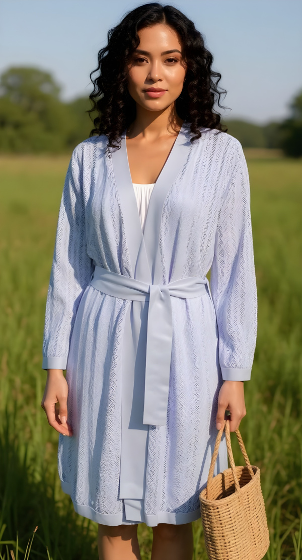 This is a long gown 48" with hand crochet around the neckline and sleeves. For ladies with a classic and elegant lifestyle.